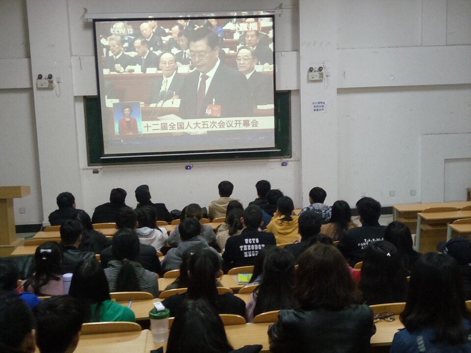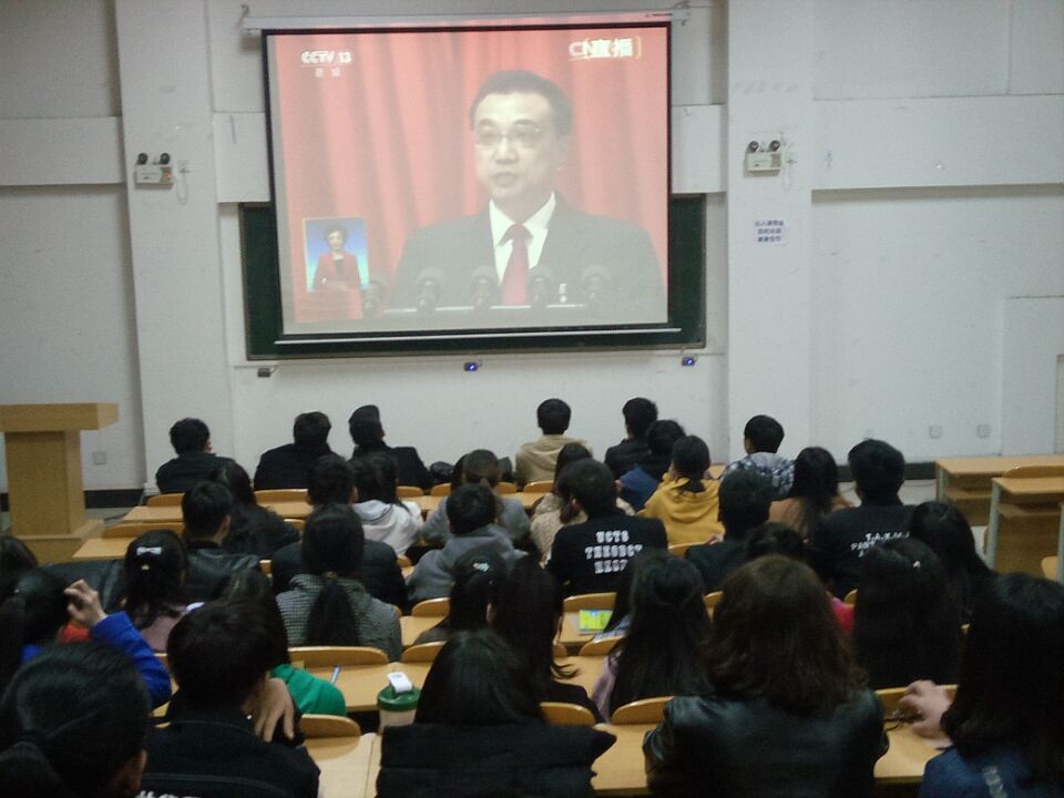 按照学校相关要求,我院组合实际,于3月5日当天,采取多种形式,组织学生观看了全国人民代表大会第十二届第五会议开幕仪式,并聆听了总理的政府工作报告。