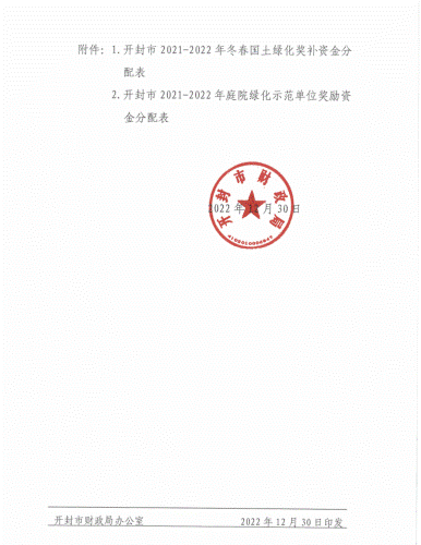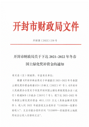 近日,开封市财政局发布了《开封市财政局关于下达2021-2022年冬季国土绿化奖补资金的通知(开财预【2022】230号)》,365英国上市集团官网获开封市2021-2022年庭院绿化示范单位奖励资金5万元。