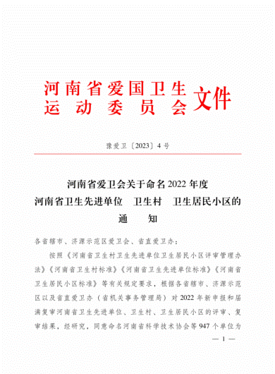 近日,365官网被河南省爱国卫生运动委员会授予“2022年度省级卫生先进单位”荣誉称号。