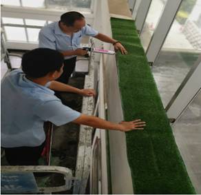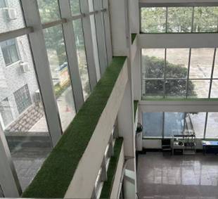“行政楼大堂铺设草坪,提供绿化办公”。因行政楼大厅各平台位置比较高,且积尘较多,暑假期间对行政楼大堂平台进行了铺设草坪绿化,铺设后绿意盎然,平台处更加整洁、干净、明亮,提升了办公环境和卫生品质。