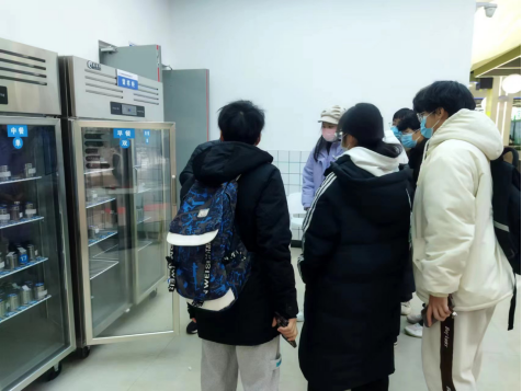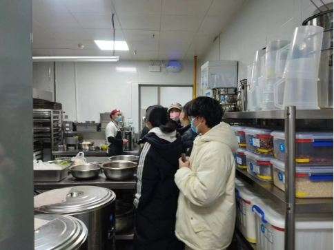 参观检查过程中,饮食管理部老师从保障食品安全的角度,对食堂原料采购、食品贮存、生产加工、食品留样、清洗消毒、餐厨废弃物处置、员工管理等方面的工作进行了详细的讲解,随后带领同学们参观了消毒间、毛菜间、切配间、操作间、48小时留样冰箱、仓库等,并引导同学们积极发现问题、提出问题。