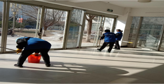 四、为迎接返校师生,保障各教学楼卫生细节,清擦教学楼玻璃门