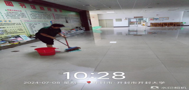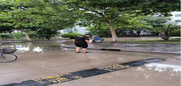 例行排查时,发现图书馆二层积水严重,立即清理地面积水避免师生滑倒摔伤,及时消除安全隐患。同时,对积水严重地段,组织人员留守巡查,随时处理可能出现的突发情况,确保平稳度汛。