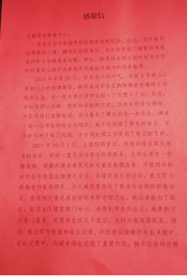 近日,后勤宿管部接连收到院部、家长和学生为宿管部工作人员写的表扬信,信中表示旨在向宿舍管理部熊燕老师和9号宿舍楼刘媛、李红和陈秀玲老师在面对突发状况时所展现出的专业素养及迅速应对能力的崇高敬意。诚挚的感激之情落于纸上,字里行间表达了对几位老师深深地感激与敬爱。