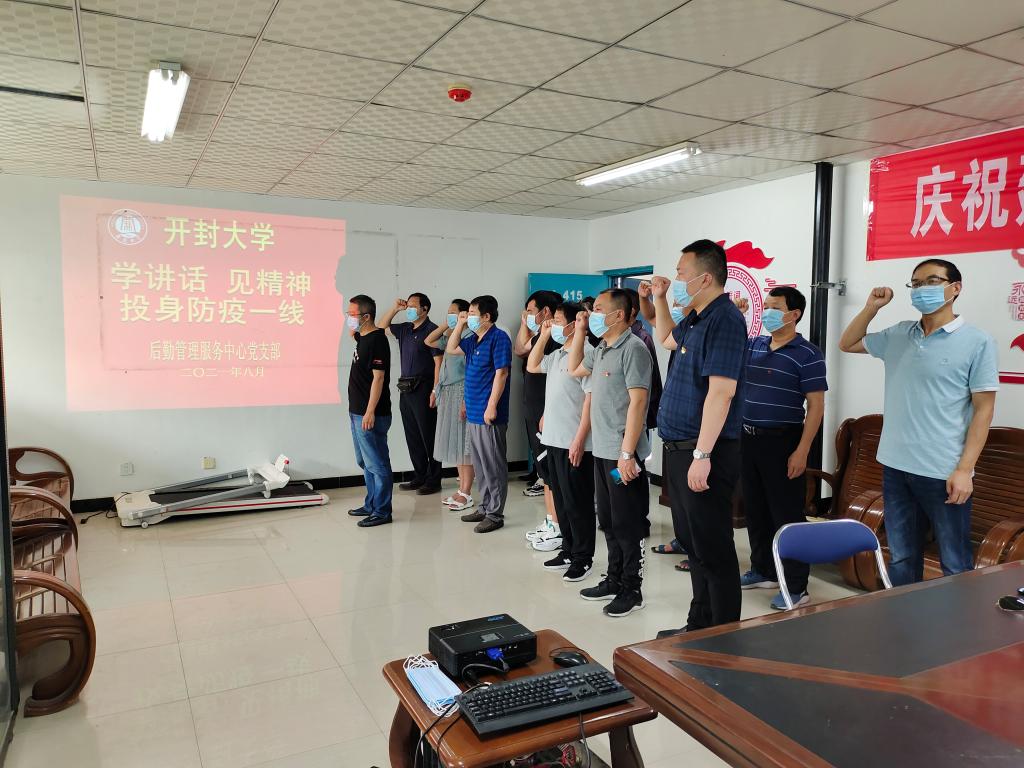 8月24日,为进一步增强党的凝聚力和战斗力,号召全体党员积极投身于排涝抢险、疫情防控等“急难险峻”的任务,后勤管理服务中心党支部组织全体党员同志在东餐厅四层大会议室开展以“学讲话、见精神,投身防疫第一线”为主题的党日活动。