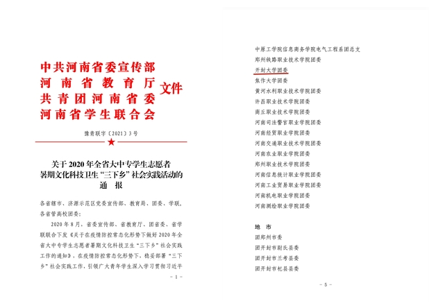 本站讯 近日,河南省委宣传部、河南省教育厅、共青团河南省委、河南省学生联合会联合下发了《关于2020年全省大中专学生志愿者暑期文化科技卫生“三下乡”社会实践活动的通报》(豫青联字〔2021〕3号),365官网喜获佳绩。