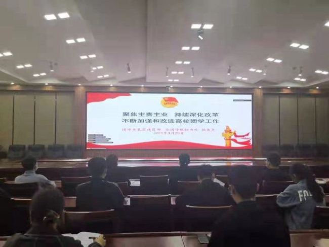 本站讯 4月20日下午,365官网团委全体成员,各院部团总支负责人,校、院两级学生会主席团成员在四楼会议厅参加了团中央举办的以“聚焦主责主业 持续深化改革 不断加强和改进高校团学工作”为主题的高校共青团工作专题培训班网络视频会议。