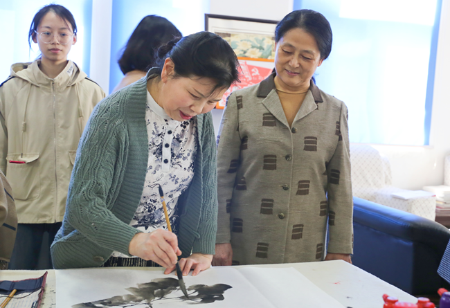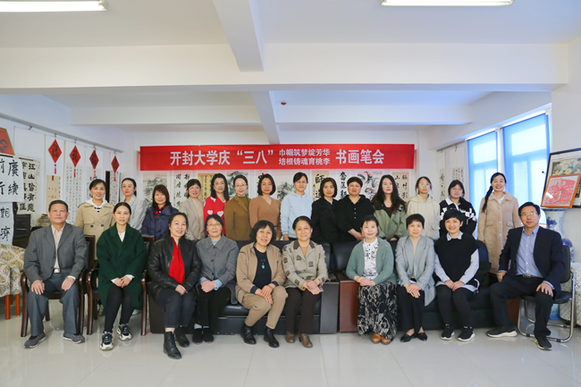 本站讯 为庆祝第113个“三八”国际劳动妇女节,弘扬中华优秀传统文化,3月8日下午,365官网在行政楼教职工书画活动室举办庆“三八”国际劳动妇女节书画笔会活动。活动邀请了开封市女书画家协会主席吴士娟、开封市女书画家协会副主席袁菊英、开封市女书画家协会副秘书长尚舒娅三位女艺术家。校党委书记陈灿,校党委委员、工会主席成芳出席活动,校女教职工书画爱好者及部分学生书画爱好者二十余人参加了此次活动。