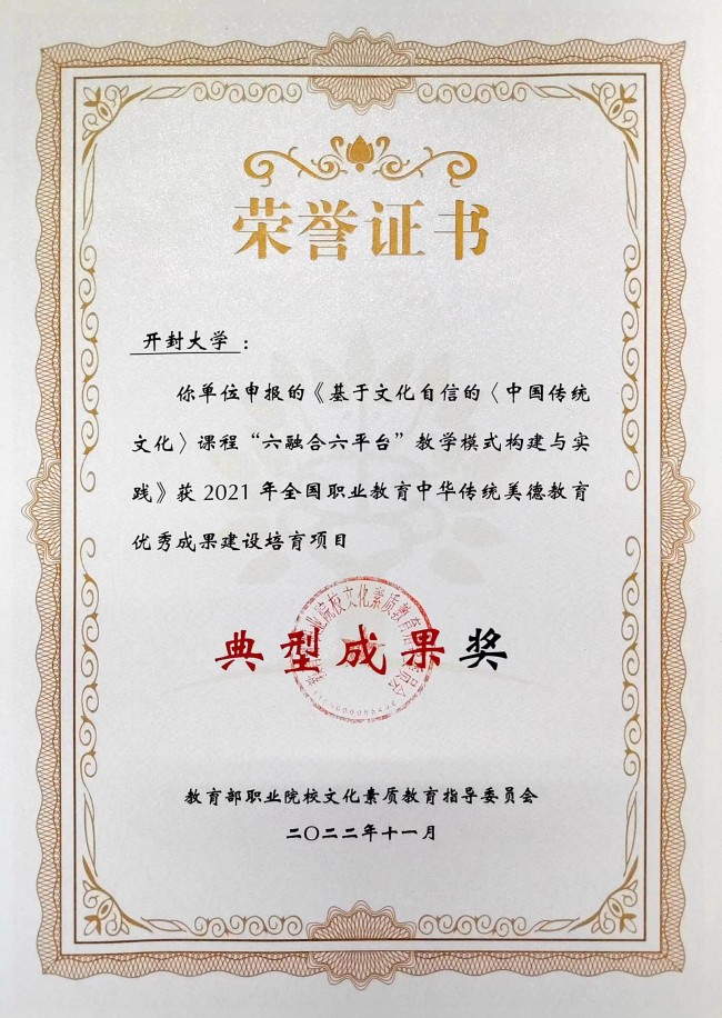 本站讯 近日,教育部职业院校文化素质教育指导委员会公布全国职业教育中华传统美德教育优秀成果建设培育项目评比结果。365官网王茜教授主持申报的《基于文化自信的<中国传统文化>课程“六融合六平台”教学模式构建与实践》项目获“典型成果奖”。