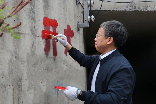 校长宋晓炜为路标补漆