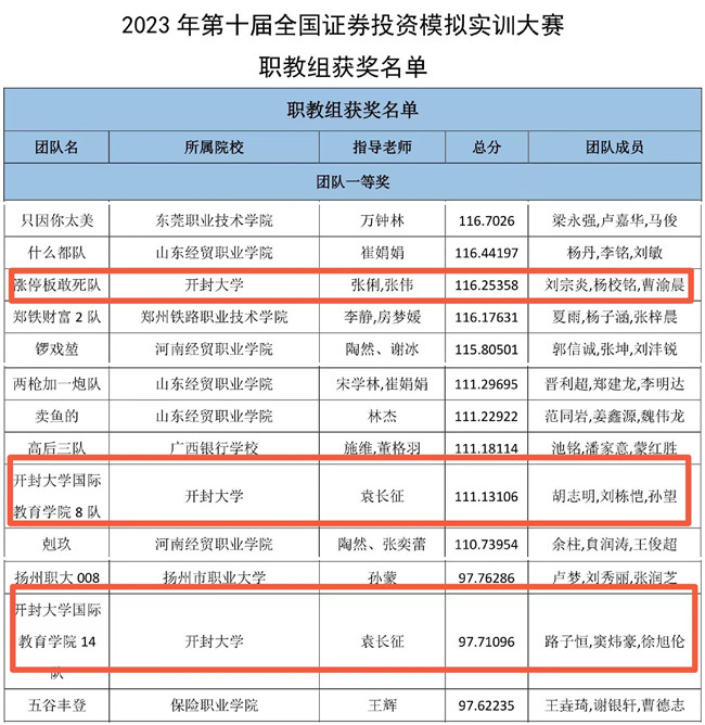 本站讯 近日,由全国金融职业教育教学指导委员会组织的2023年第十届全国证券投资模拟实训大赛顺利结束。本次大赛共有本科组296所院校的13711支队伍参赛,职教组226所院校的6500支队伍参赛。大赛以线上投资模拟(股票、基金、债券)方式进行,各参赛队伍线上模拟投资,按照总账户收益率排名。