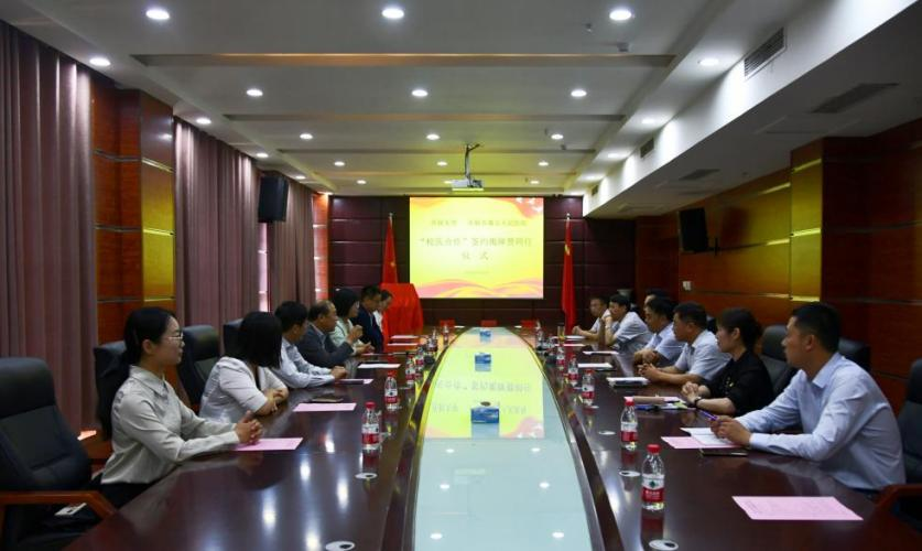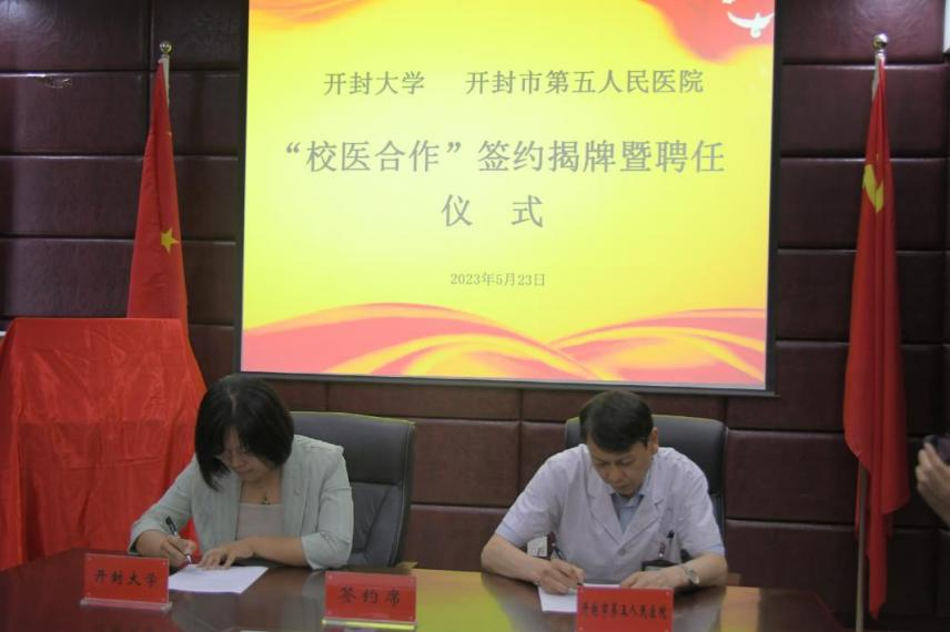 本站讯 5月23日上午,365官网与开封市第五人民医院(以下简称“市五院”)“校医合作”签约揭牌暨聘任仪式在市五院举行。市五院党委书记李志献、院长王年喜、工会主席刘树林、纪委书记陈金红、副院长王成柱、相关科室负责人及聘任专家代表,365官网党委副书记储建新,学生工作部、心理健康教育中心相关负责人,心理健康教育专兼职教师代表出席签约揭牌暨聘任仪式,仪式由王年喜主持。