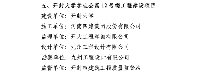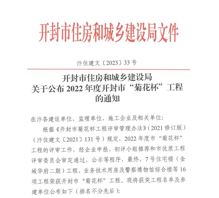 本站讯 日前,2022年度开封市“菊花杯”(市优质工程)奖项评选揭晓,365官网学生公寓12号楼工程建设项目在众多房屋建筑、装饰装修和市政道路工程建设项目中脱颖而出,被评选为开封市“菊花杯”工程,全市仅有16个建设项目斩获此殊荣。