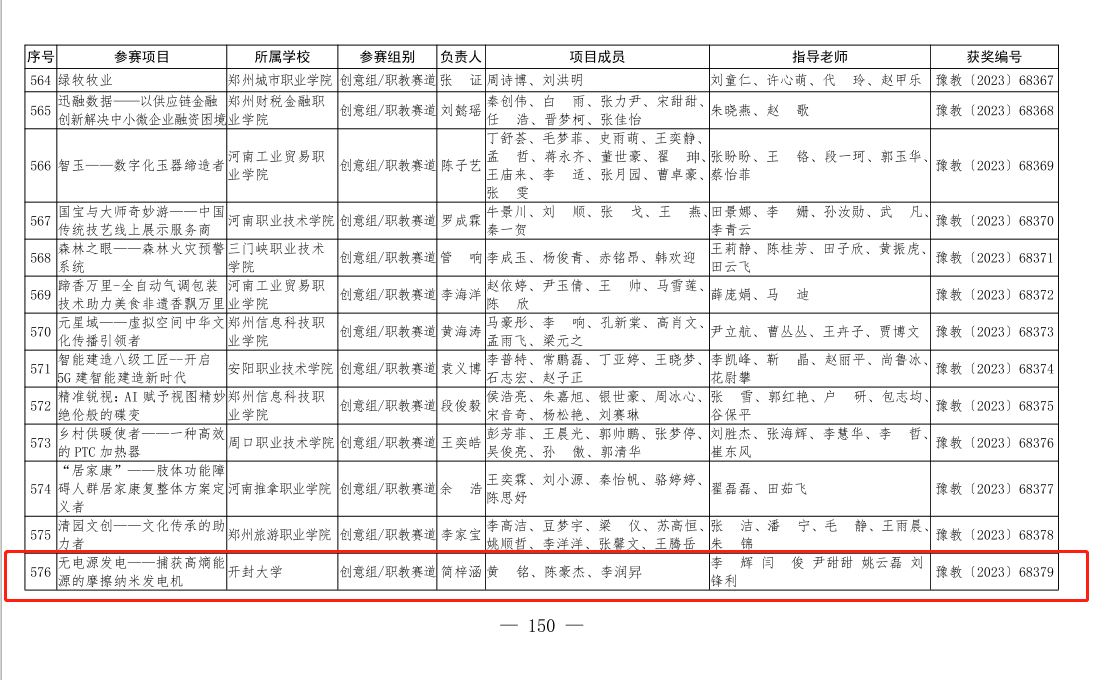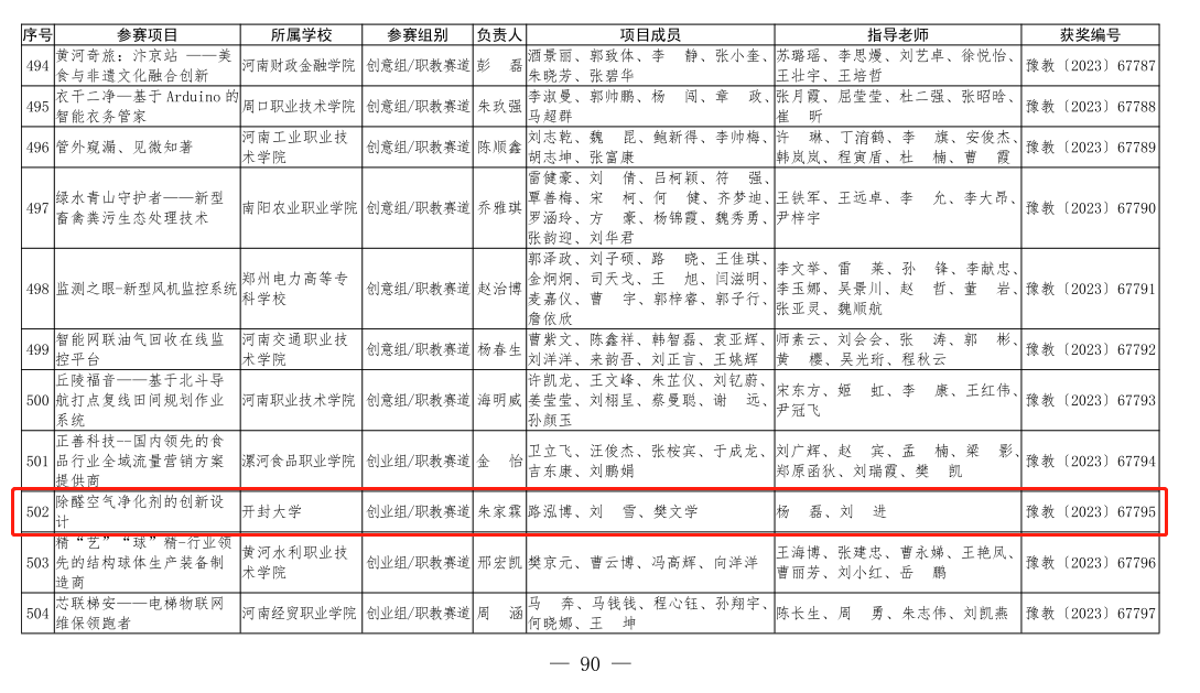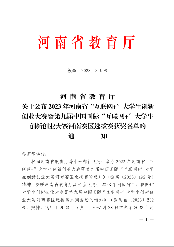 本站讯 近日,河南省教育厅公布了2023年河南省“互联网+”大学生创新创业大赛暨第九届中国国际“互联网+”大学生创新创业大赛河南赛区选拔赛获奖名单,365官网荣获省级二等奖1项、三等奖1项。其中二等奖项目《除醛空气净化剂的创新设计》入围全国总决赛,实现了365官网在“双创”类比赛中的重大突破。