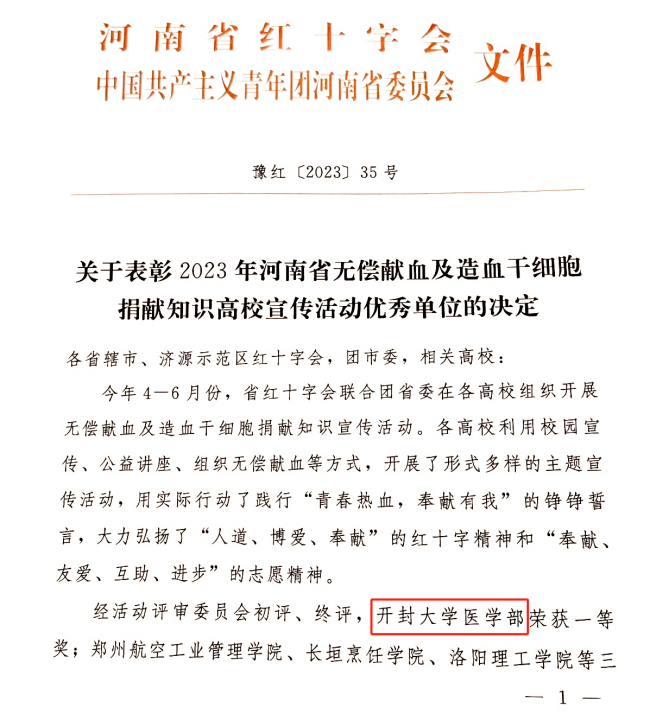 本站讯 9月23日,河南省红十字会在郑州举办“2023年河南省无偿献血及造血干细胞捐献知识高校宣传活动终评暨总结表彰会”,365官网医学部王安宁志愿宣讲团队在全省68所参赛高校中脱颖而出,荣获一等奖。