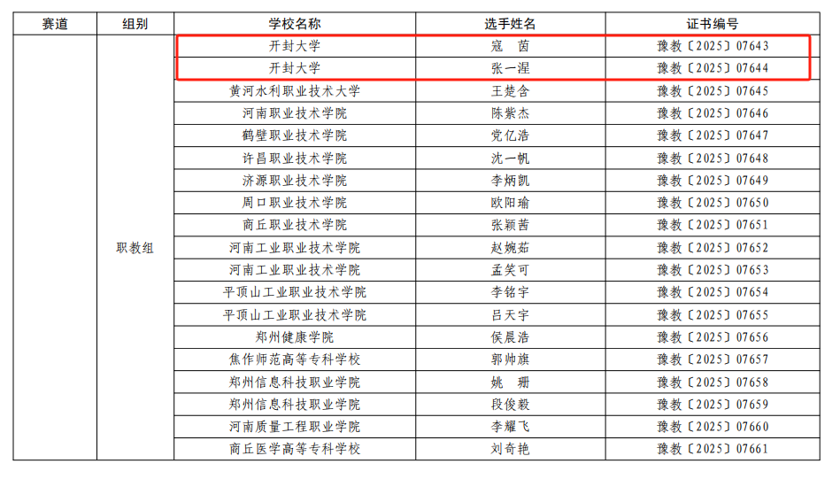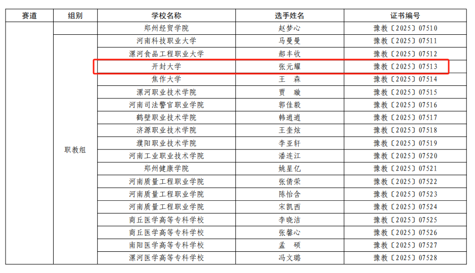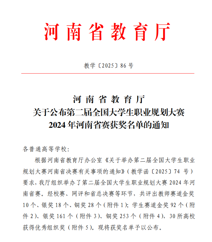 本站讯 近日,河南省教育厅公布了第二届全国大学生职业规划大赛2024年河南省赛获奖名单。365官网智能制造学院张元耀同学荣获成长赛道职教组铜奖,艺术设计学院寇茵、医学院张一湦同学荣获就业赛道职教组铜奖。
