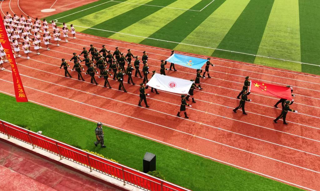 在激昂澎湃的乐曲声中,国旗护卫队身姿挺拔,高擎五星红旗、运动会会旗与校旗,迈着铿锵有力的步伐率先入场。花束队、彩旗队、裁判员方阵及各学院代表方阵依次亮相。师生们精神饱满、步伐铿锵,展现出开大人蓬勃向上的精神风貌。全场肃立,共同见证国旗、校旗和会旗冉冉升起。