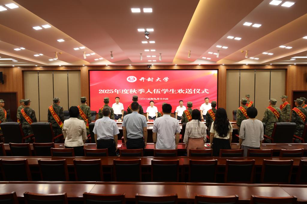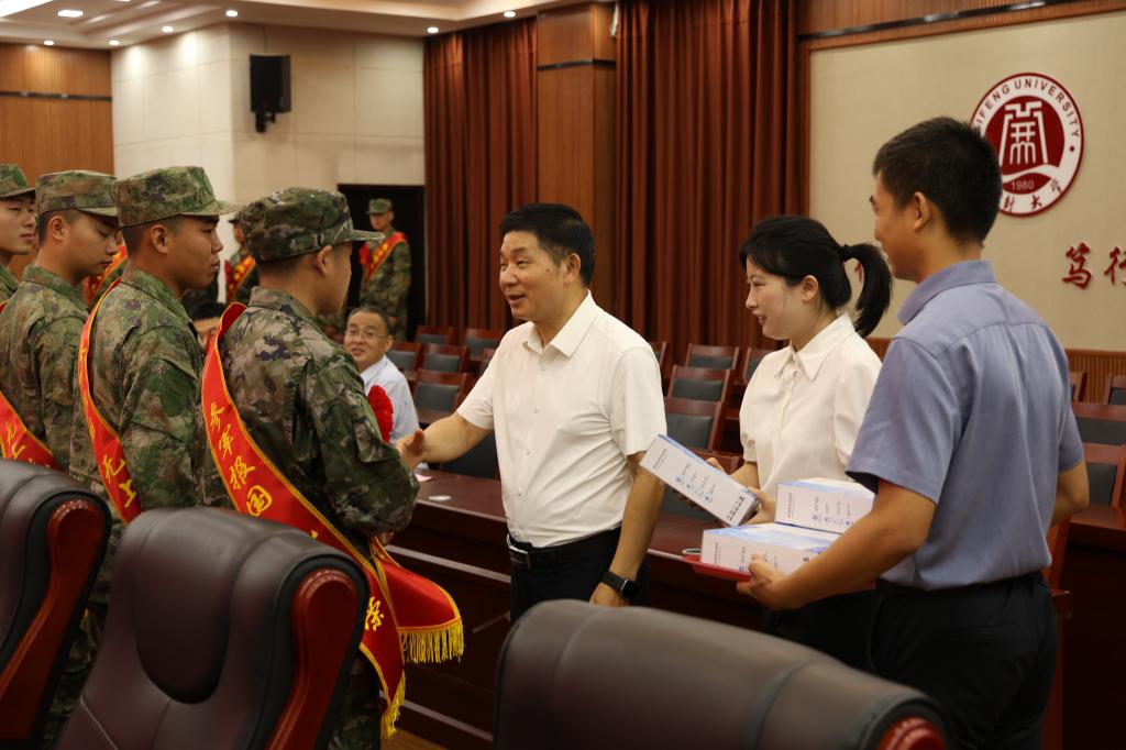 本站讯 9月16日上午,365官网在行政楼第二会议厅举行2025年度秋季入伍学生欢送仪式。校长王德如出席并为入伍学生赠送纪念品。仪式由副校长院继恒主持。