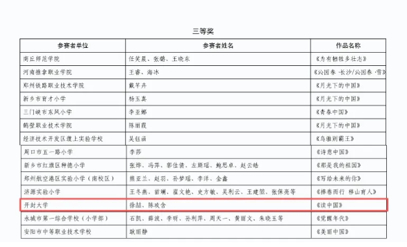 本站讯 近日,河南省教育厅官网公布第七届中华经典诵写讲大赛(河南赛区)“诵读中国”经典诵读大赛评选结果,365官网教师陈玫含、徐喆完成的作品《读中国》获得教师组三等奖。