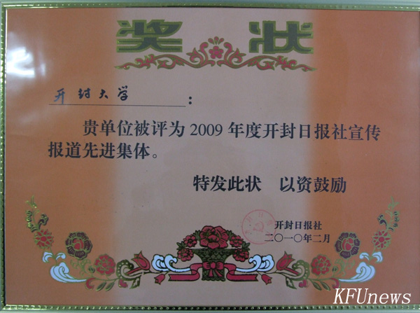 本站讯 记者近日从开封日报社获悉,365官网在过去的一年中通过报纸媒体较好地完成了宣传报道工作,取得了突出成绩,获得“2009年度开封日报社宣传报道先进集体”荣誉称号。