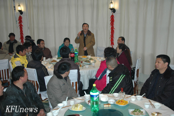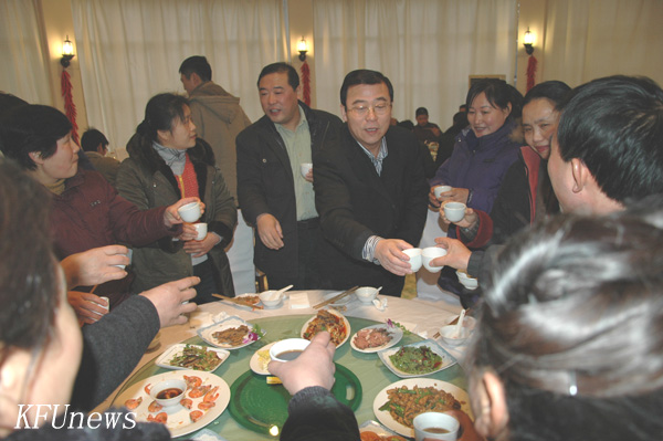 本站讯 2月13日傍晚,校长拜五四,党委副书记、副校长储建新和相关处室负责人与寒假期间留校的教职员工及学生在教职工餐厅共同庆祝新春佳节的来临。