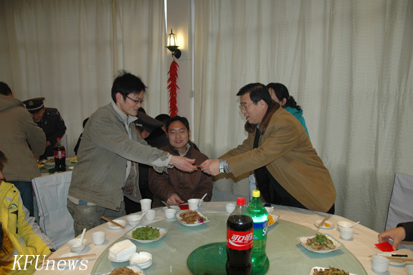 在除夕夜的团圆晚宴上,拜校长代表校党委、校行政向春节留校的师生员工们拜年,为大家献上了美好的祝愿,并向每一位留校同学发放了压岁钱红包。随后,师生们坐在一起觥筹交错、谈笑风生,在欢快、热烈的氛围中迎接农历新年的到来。