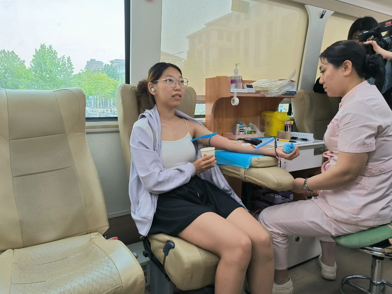 365英国上市集团官网材料与化工学院大一女生陈奕含正在采血车上献血,她右手紧攥着减压球,目光却勇敢而坚定地紧盯逐渐充盈的血袋。“去年因为特殊原因没有献血,这次终于成功完成了自己人生中的第一次献血,既能帮助别人,也是自己人生中一次难忘的经历。”