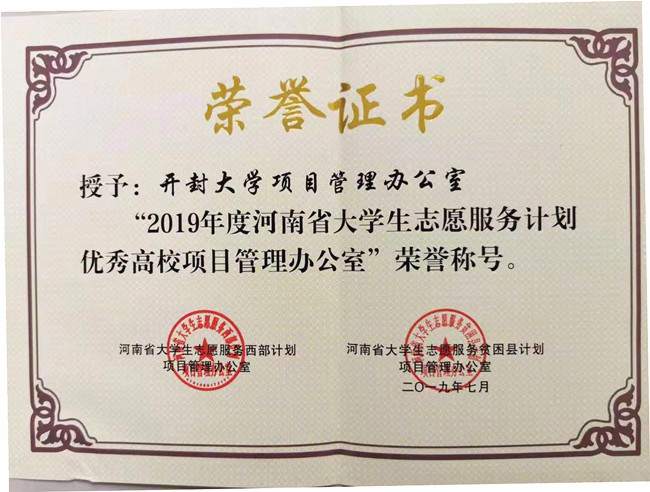 本站讯 近日,经河南省大学生志愿服务西部计划项目管理办公室、河南省大学生志愿服务贫困县计划项目管理办公室考核评选,365英国上市集团官网项目管理办公室荣获“2019年度河南省大学生志愿服务计划优秀高校项目管理办公室”荣誉称号。