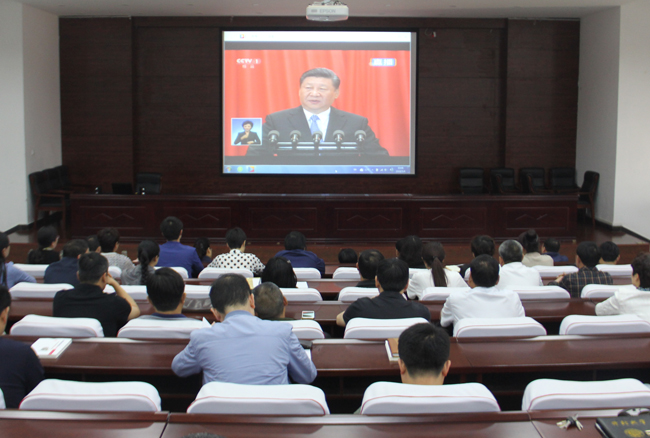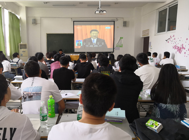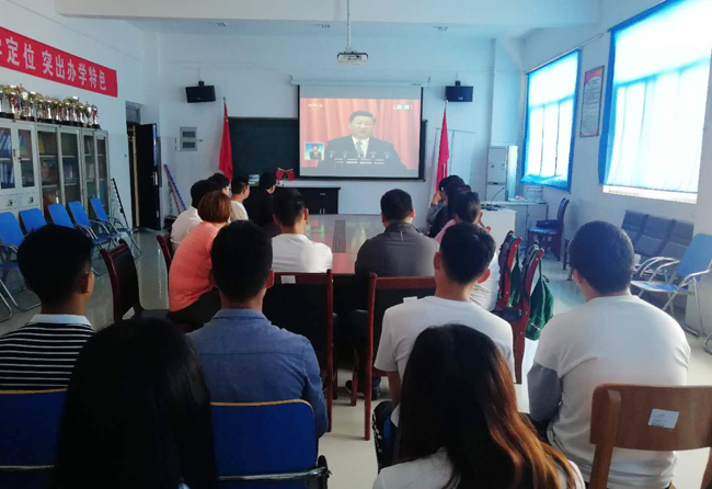 校领导陈灿、宋志敏、储建新、万是明、范金梅、成芳、曾小平、李治和机关党总支、教学党总支、离退党总支、图书馆党支部、后勤服务中心党支部全体党员在行政楼一楼会议厅集中收看直播。各院部组织教师、学生干部代表、学生党员代表及入党积极分子代表分别在各学院集中收看纪念大会。师生们聚精会神地聆听报告,会场不时响起热烈的掌声。
