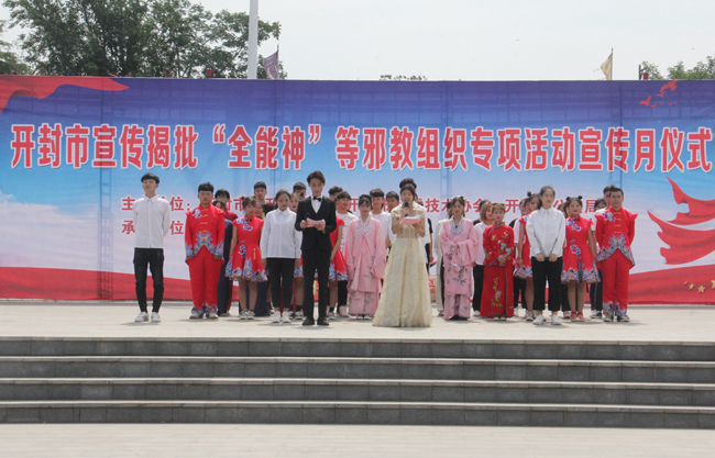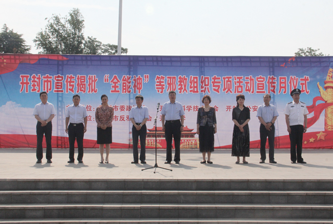市委政法委副书记张柏松致辞,市科协主席吴良讲话,黄河水利职业技术学院学生代表宣读倡议书,市委常委、政法委书记胡荣启宣布开封市宣传揭批“全能神”等邪教组织专项活动宣传月启动。