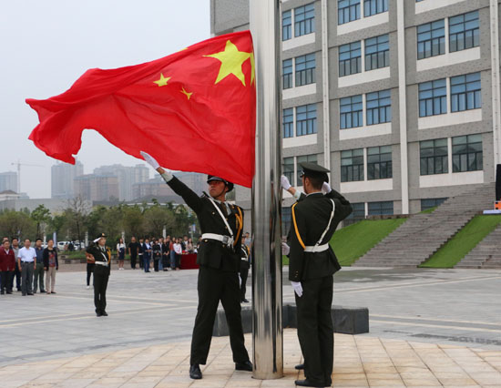 校国旗护卫队的旗手从校长宋志敏手中迎过鲜艳的五星红旗,在庄严雄壮的国歌声中,将五星红旗冉冉升起,全校师生行注目礼。