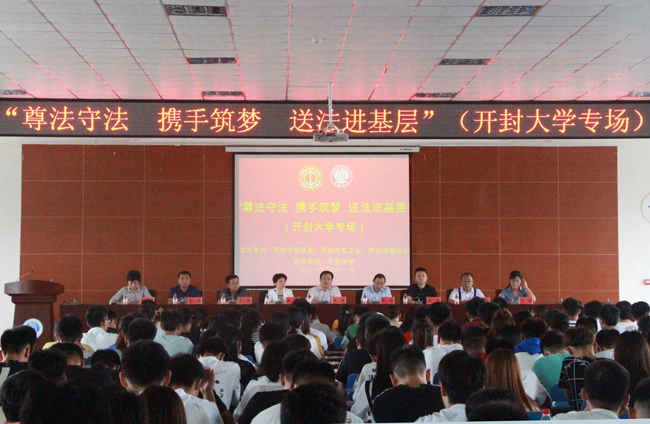 开封市司法局党委委员、依法治市办副主任王璐讲话。他指出,加强法制宣传教育是建设社会主义法制国家的要求,是全面建成小康社会的基础。随着社会的进步,各种违法现象层出不穷,特别是面对诱惑缺乏辨别能力的学生们,更应该加强法制宣传教育,提高大学生综合素质,为建设社会主义法治国家做出贡献。