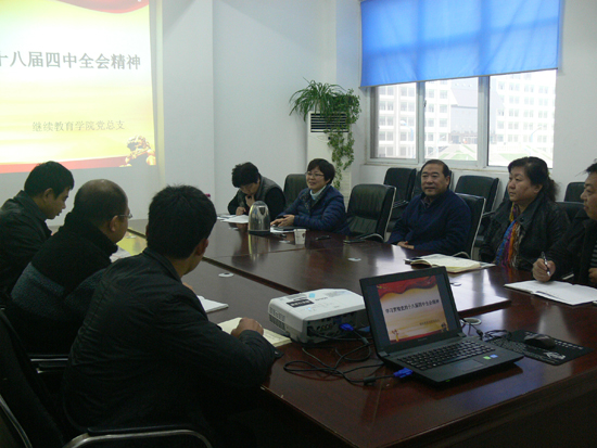 本站讯 11月10日下午,继续教育学院党总支召开组织生活会,全体党员集中学习党的十八届四中全会精神,会议由院党总支书记孟祥茹主持,校党委副书记储建新出席会议并讲话。