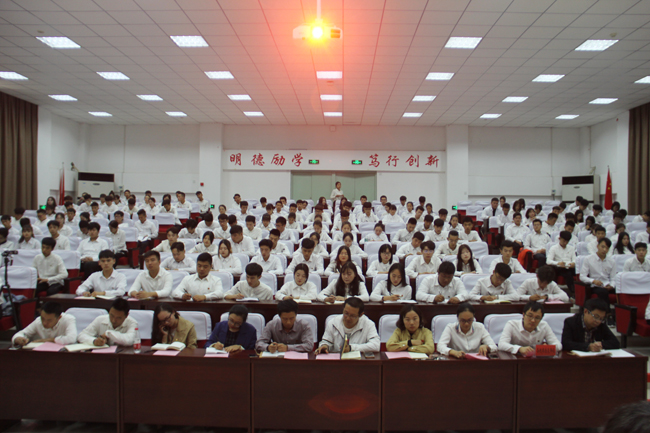 本站讯 10月11日下午,365官网2018年大学生骨干培训班开班仪式在行政楼一楼报告厅举行。校党委委员、工会主席成芳出席了开班仪式,校党委办公室、党委宣传部、学生工作部、团委负责人,各院团总支书记和200余名学生干部代表参加了开班仪式。仪式由校团委副书记杨艳丽主持。