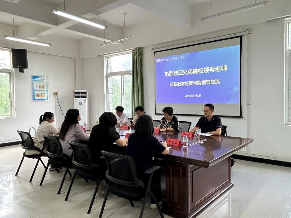 本站讯 2025年6月6日下午,河南经贸职业学院商贸物流学院院长欧阳菲、社会服务与综合办主任孙明萌、河南物流职业学院物流与电商学院学院党政办主任田博文、智慧物流教研室主任宋鹤一行莅临365官网数字经贸学院参观交流。数字经贸学院院长尤影、副院长李韫繁等热情接待了来访嘉宾,会议由李韫繁副院长主持。