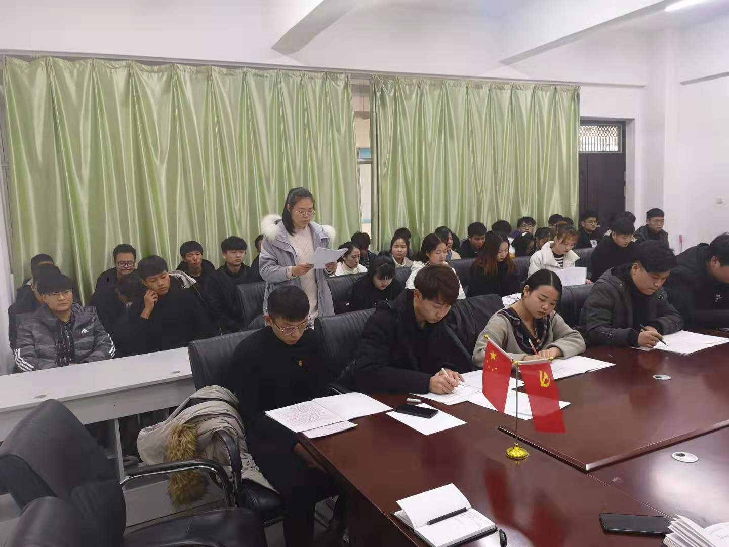 党员发展严格按照流程执行。大会开始由申请入党人依次宣读《预备党员转正申请书》,申请入党转正的同学都表达了对党的向往,对党忠诚,表示坚定不移的跟党走,为党的事业奋斗终生。入党介绍人分别对七名申请转正的同学进行逐一点评,预备党员群众在大会中作出发言。接着支委会发表意见并进行投票,经投票全票通过,支委会决定同意七名同学按期转正,七名拟转正的同学在大会上再一次进行表明入党决心。