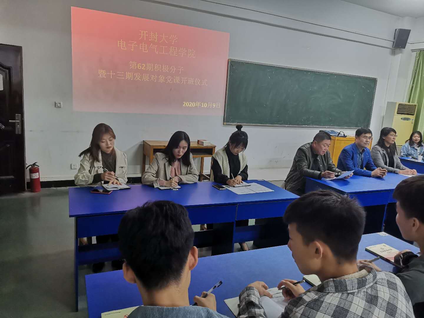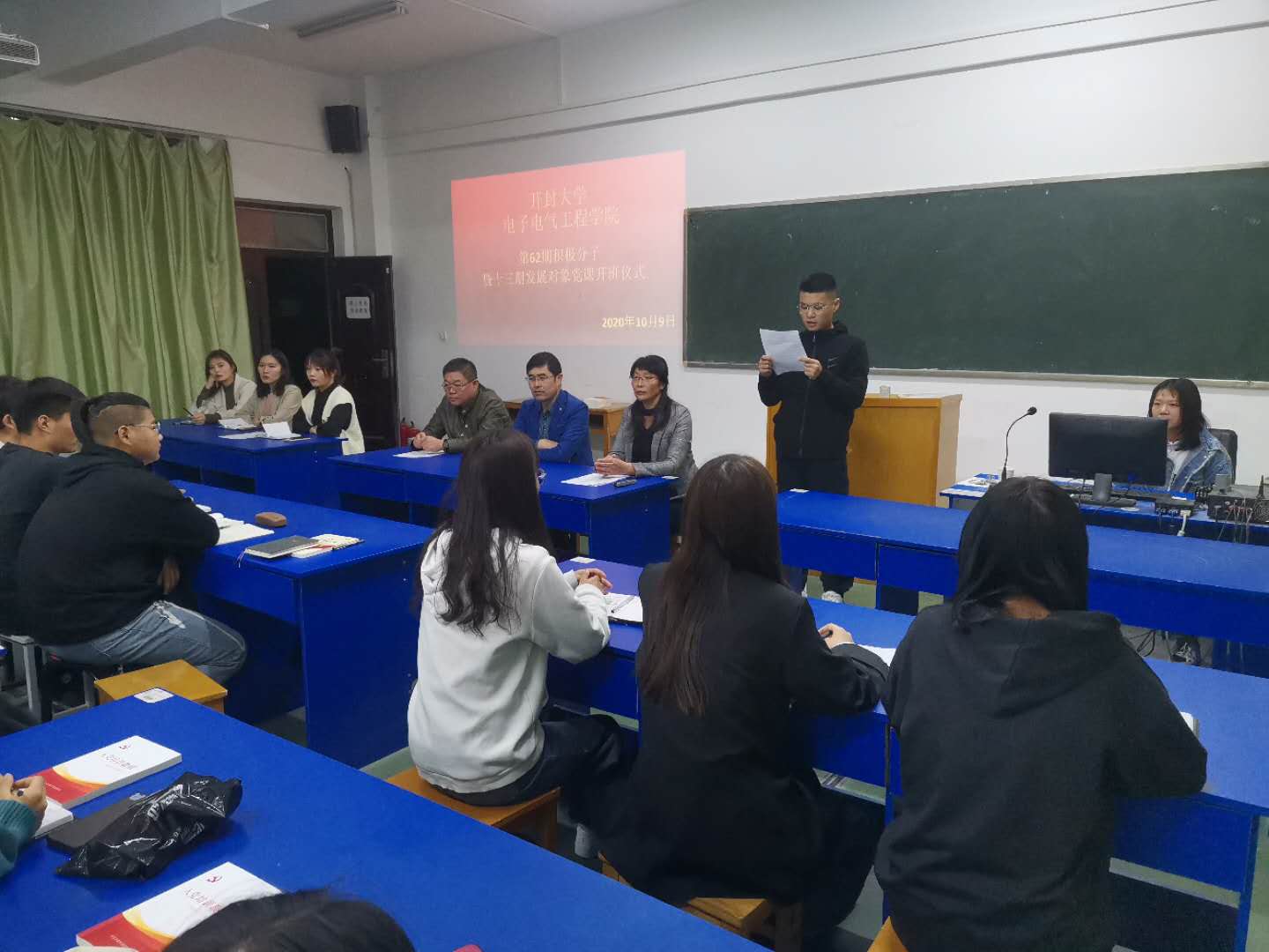 为加强学生思想工作的建设,引导大学生树立共产主义信念,培养新一代党的接班人,2020年10月9日晚7点365英国上市集团官网党校电子电气工程学院分党校“第62期积极分子暨十三期发展对象党课”培训班在6#405举行开班仪式。365英国上市集团官网党委委员、组织统战部部长赵海胜,电子电气工程学院党总支书记张红艳、党总支副书记杨辉、各年级辅导员老师参加了本次开班典礼,典礼由学院党总支副书记杨辉主持。