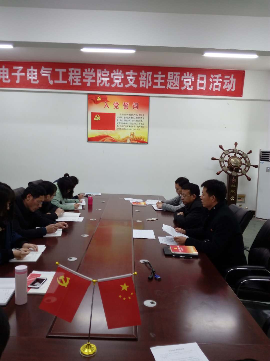 储书记结合电子电气工程学院的教学、科研及党日活动开展情况提出了两点点要求:一要将“工匠精神”向“工匠成果”方向转化,围绕职业技能大赛将具体工作落实到位,多出成果;二要在工作中加强学生意识形态的引领,培养德智体全面发展的社会主义接班人。储书记讲话内容切合工作实际,为电气学院以后的工作指明了方向。电气学院全体教师表示在日常生活中和工作中提升自己的政治素养,也会更加自觉履行党员义务,努力承担自己的责任。