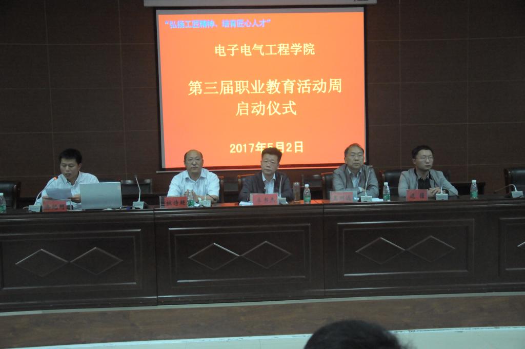 为了营造迎接党的十九大胜利召开的良好氛围,大力弘扬“劳动光荣、技能宝贵、创造伟大”的时代风尚,大力弘扬和培育“工匠精神”,努力塑造以“工匠精神”为核心的院部文化。5月2日,电子电气学院在365官网土木工程学院六楼报告厅举行了第三届职业教育活动周开幕仪式,出席会议的有开封树杰模具有限公司总经理李树杰先生、365官网校企合作处处长杜诗超,电子电气工程学院院长高明远。学院全体教职员工以及在校生400余人参加了开幕式。会议由学院党总支书记徐纪珂主持。