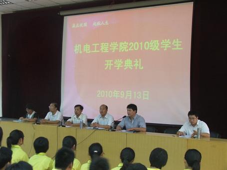 本站讯:9月13日上午,机电工程学院在报告厅举行2010级新生入学典礼,出席典礼的有院党总支书记李继方、院长杜诗超、副院长高明远、团总支书记和新生辅导员老师,副书记鲁建明主持典礼。