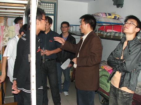 老师们带领着学院学生会的干部、各班班长、团支书分别到学7公寓、学10公寓等宿舍楼,对每个学生寝室逐一排查。检查的重点,其一是宿舍的卫生以及宿舍文化的建设,其二是对宿舍安全问题的排查。经过检查,发现绝大部分的寝室卫生还是保持得比较好,还有一些寝室在宿舍进行了精心的布置。但是也有一些宿舍的室内卫生还有待进一步提高和加强。对于有问题的宿舍,老师们一一做出了要求,并提出整改的措施。