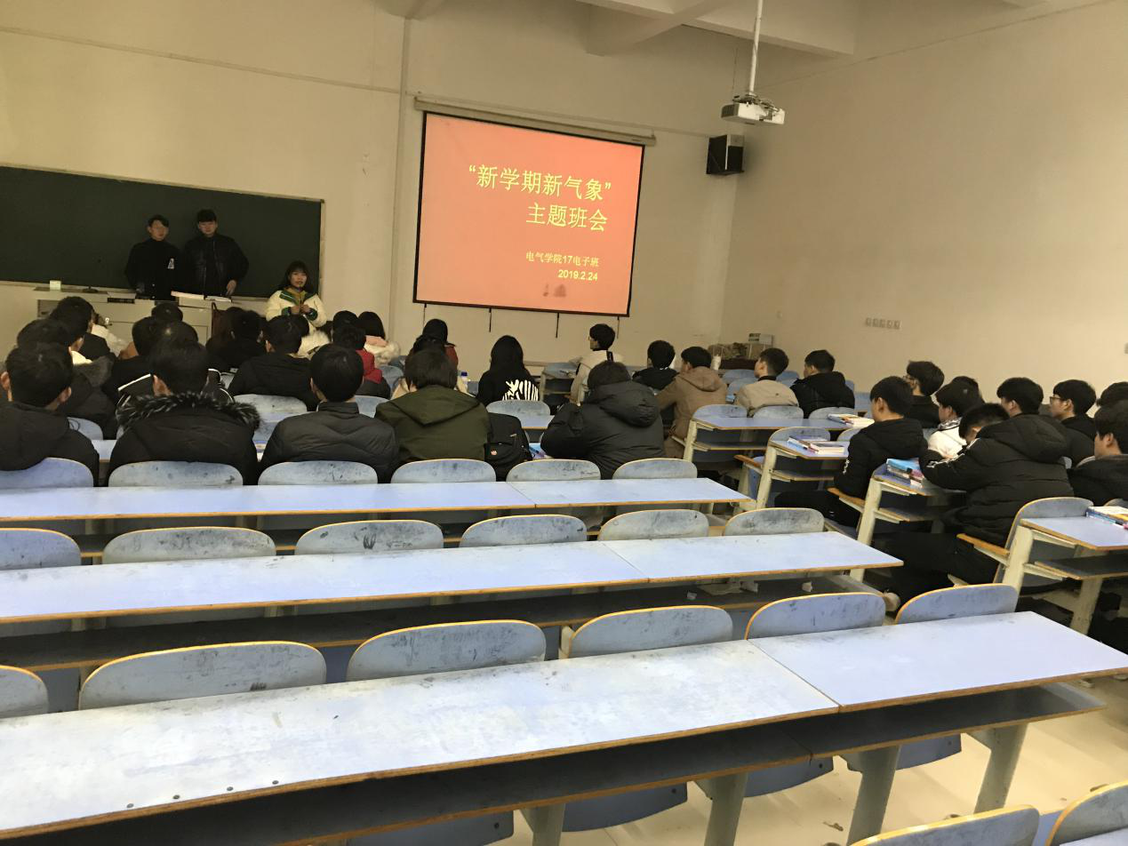 为迎接新的学期到来,2019年2月24日上午10:10至12:00,下午2:00至4:00,电子电气工程学院各班级召开了以“新学期新气象”为主题的班会。电子电气工程学院副院长边疆,党总支副书记杨辉及各年级辅导员参加了本次会议。班会上同学们讲述了自己的寒假经历,有的外出勤工俭学,有的考驾照等等,每个学生都在假期生活体验中有所成长。之后,各年级辅导员对开学“五个一”进行了详细布置,从第一次内务检查,第一次主题班会,第一次升国旗,第一节课,第一次考勤的行动中,让同学们迅速投入到新学期的学习活。