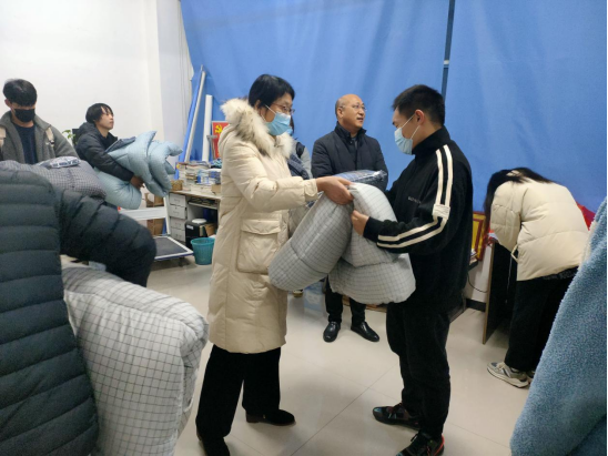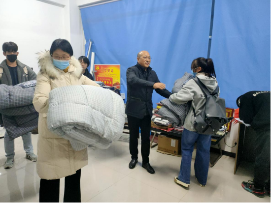 杨书记首先向大家介绍了学校的资助工作,通过冬季御寒物资的发放,为家庭经济困难学生送去温暖和关心。杜院长和同学们亲切交谈,了解同学们最近的生活和学习状况,鼓励大家一定要有积极乐观的心态,要有信心,相信困难是暂时的。同时,勉励同学们珍惜党和国家对大学生的资助和关怀,脚踏实地、刻苦学习,努力成为理想远大、具有强烈社会责任感的优秀人才。张书记鼓励同学们积极投入到期末备考中来,不辜负老师们的关爱和期望。做自立自强、懂得感恩的大学生,努力成才,以实际行动报答党和国家。随后,院领导亲自为同学们发放了冬季御寒物资,每人一床棉被,一套三件套床上用品。虽已是寒冬,同学们心里却暖融融的,在场的同学们纷纷表示感谢,学校的资助不仅仅是经济和物资上的帮扶,更是精神上的鞭策,这份力量将激励他们好好学习、心怀感恩、回馈社会。