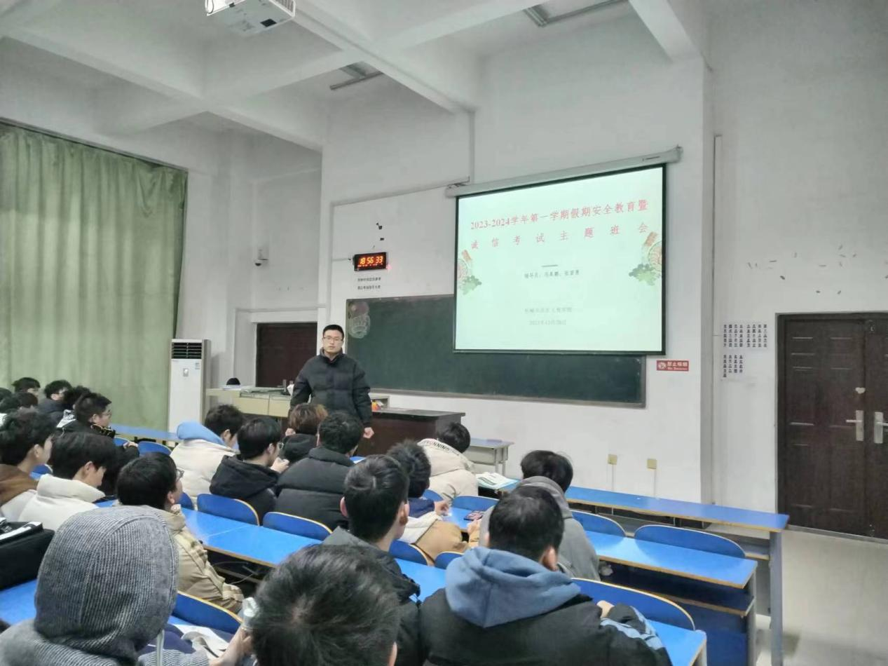 为了确保本学期期末及元旦假期、寒假各项工作的顺利推进,加强学风建设,严肃考风考纪,增强学生安全防范意识,12月28日,机械与汽车工程学院在15号楼召开2023-2024学年第一学期假期安全教育暨诚信考试主题班会,活动由辅导员冯真鹏、张雷勇组织,2023级全体同学参加。