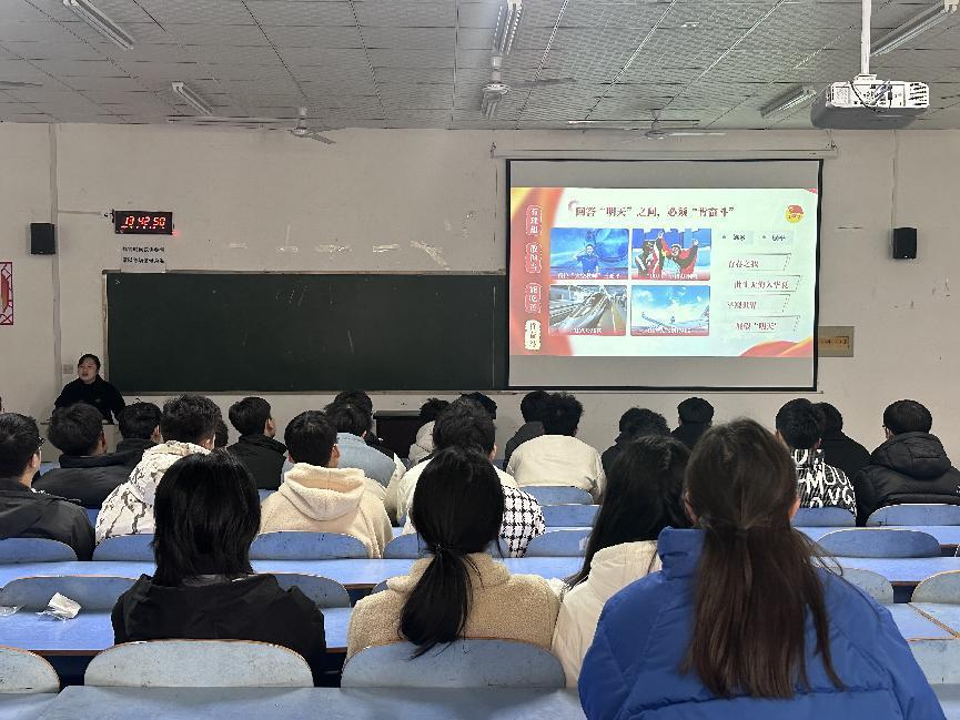 12月9日中午,在15号楼222教室学院团总支书记王文慧为50名团员青年上以“一二·九运动,学习党的二十大回顾缅怀英雄魂”为主题的团课。王文慧从历史背景、运动意义、中国青年答时代问及青年人的挺膺担当等五个方面给同学们进行了讲解,她希望同学们要以革命先烈为榜样,不忘初心、牢记使命,坚定理想信念,树爱国之情,立远大志向。牢记习近平总书记对青年的要求,踔厉奋发,笃行不怠,投身于祖国的建设之中,贡献出自己的力量。