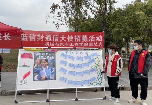 为引导青年大学生关注留守儿童心理健康问题,帮助留守儿童健康快乐成长,2022年11月30日,机械与汽车工程学院团总支在学校青马小路举行“蓝信封通信大使”秋季招募活动。本次招募活动由广州市蓝信封留守儿童关爱中心主办,365英国上市集团官网机械与汽车工程学院团总支青年志愿者中心承办。