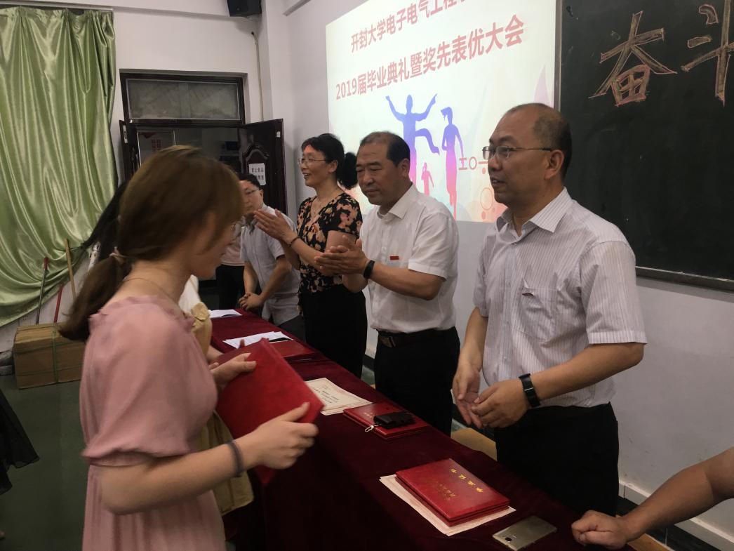 会议开始,全体肃立合唱国歌。首先,由边疆副院长宣读2019届各班毕业生资格审查决定,杨辉副书记宣读了2019届优秀毕业生名单等各项表彰决定。储书记及学院领导班子成员为学生颁发毕业证书、获奖证书。接着,毕业生代表姜秀发言,表达了对母校和老师的感谢与不舍,表达了展望未来、奔赴青春的昂扬斗志。