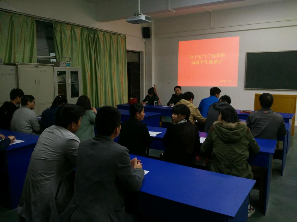 为了畅通信息沟通渠道,准确及时把握学生思想、学习、生活等动态,进一步深入推进学院学风建设。电子电气工程学院于11月7日到9日下午,在6号楼405教室分别组织召开了三个年级学生的学风建设座谈会,学院相关领导、辅导员老师和部分学生代表参加此次座谈,学院党总支副书记边疆主持会议。在座谈会上,边书记首先发言强调了此次座谈会的意义和作用在于建立“教师”与“学生”、“管理教育”与“学习成长”良性互动的常态化机制,并鼓励学生代表们积极反应有关问题。参加座谈会的学生代表针对学生比较关心的任课老师授课方法,学生宿舍和教室教学设施不完善,宿舍及教室卫生管理,早操晚自习及考勤制度,班级奖助学评定等问题进行了提问和咨询,院领导现场对于所有问题均给予了答复,对于部分无法第一时间落实解决的问题均做了详细记录,对学生反馈的信息给予了充分的重视。