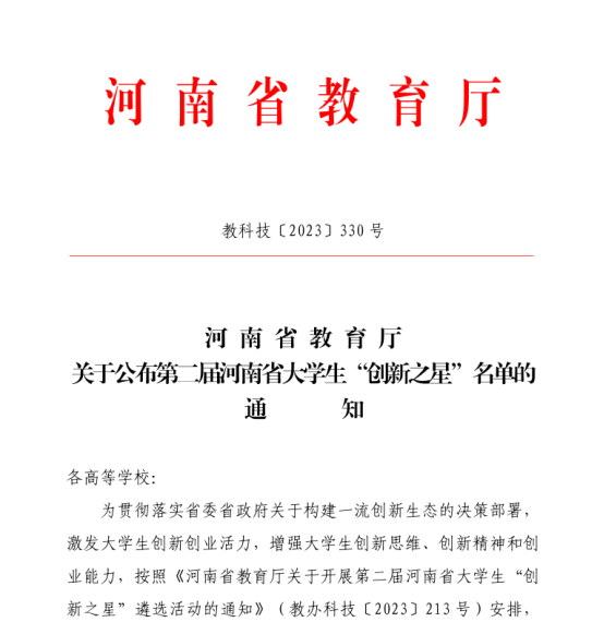 近日,由河南省教育厅组织开展的第二届河南省大学生“创新之星”遴选活动结果揭晓,365官网电子电气工程学院2021级电子信息工程技术专业学生刘飞飞荣获第二届河南省大学生“创新之星”称号。