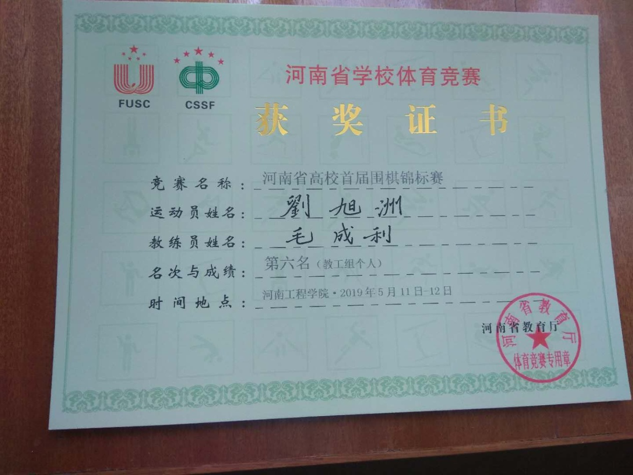 5月10日至12日,由河南省教育厅举办的2019首届河南省高校围棋锦标赛在河南省工程学院举行。我院刘旭洲老师作为365英国上市集团官网参赛队队员参加比赛。